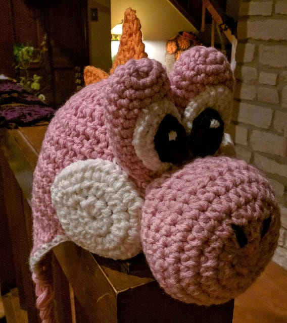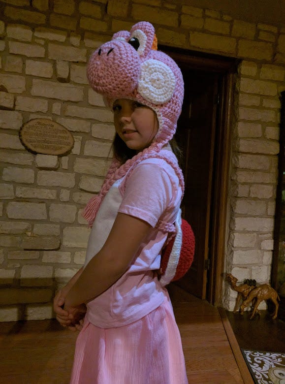 At the time, Yoshi costumes were hard to find, and patterns were scarce, so I decided to make it myself. I dove into a creative frenzy. I sourced a basic cap pattern, engineered the perfect set of big, adorable Yoshi eyes, and found a pattern for the iconic shell. I worked through the night, fueled by caffeine and the pure desire to see her smile. By morning, the costume was complete, and she went to school a very happy, very cute little dinosaur. The hat was the centerpiece and has gone on to be a beloved post and family treasure, a testament to that late night hustle.
